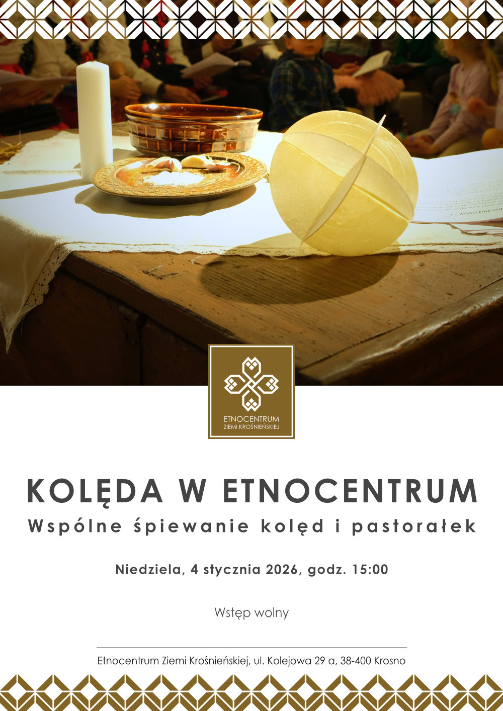 Serdecznie zapraszamy do wspólnego kolędowania w Etnocentrum Ziemi Krośnieńskiej, które odbędzie się 4 stycznia 2026 roku. Spotkanie poprowadzi Aleksandra Cieślik wraz z Zespołem Śpiewaczym działającym przy Etnocentrum.
