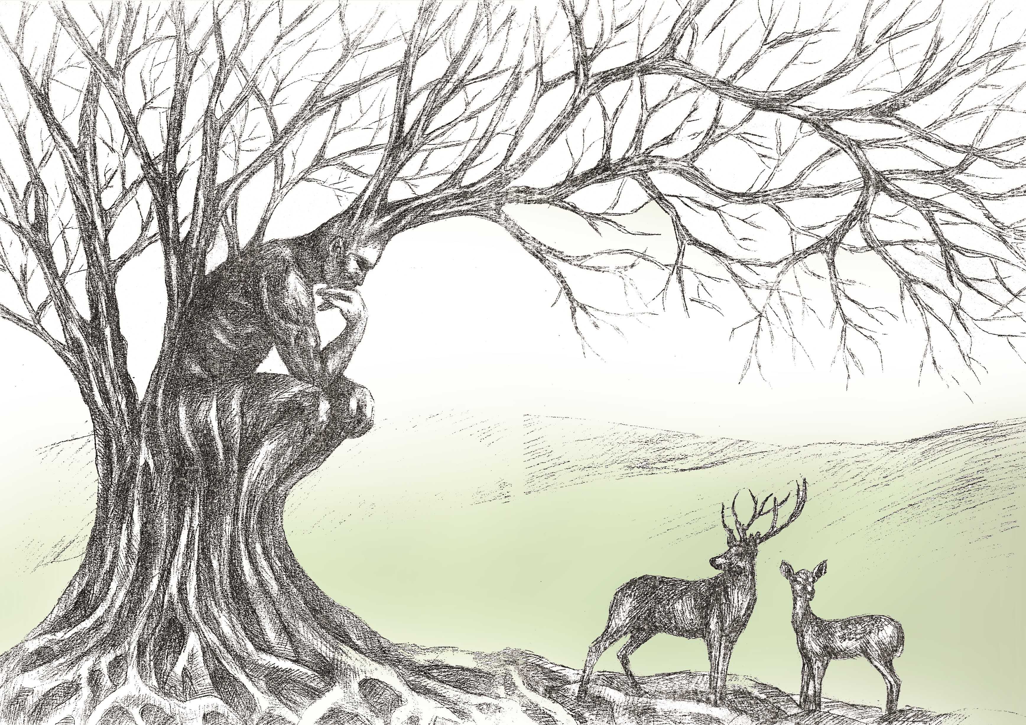 To obraz dębu, który ma ludzki kształt – jest symbolem duchowego rozwoju, który chce dotrzeć do prawdy. Kiedyś był małym żołędziem, a teraz jest myślącym stworzeniem, które chroni wszystko wokół siebie. Obok niego znajdują się jelenie, malutkie, delikatne, potrzebujące ochrony. To nie jest zwykłe drzewo - to obraz człowieka, który dorastał przez ból, czas i próby. Jego ciało jest duchem zakorzenionym w naturze. To historia wzrostu: od małej, bezbronnej osoby do dużej i mądrej.